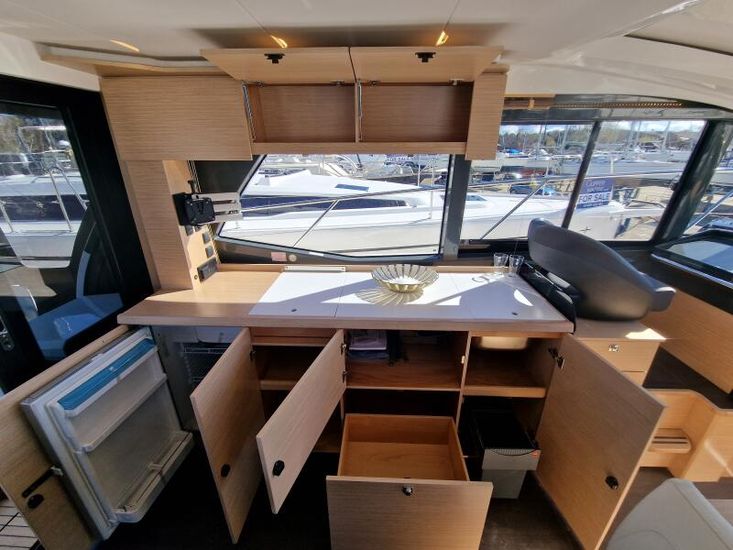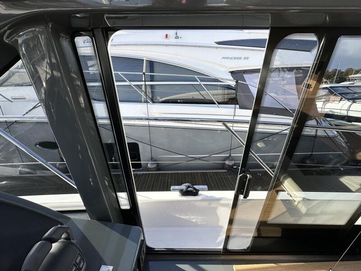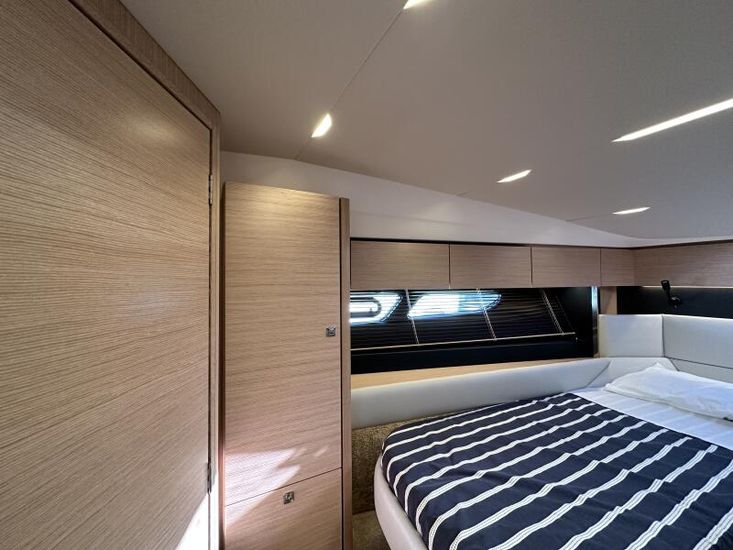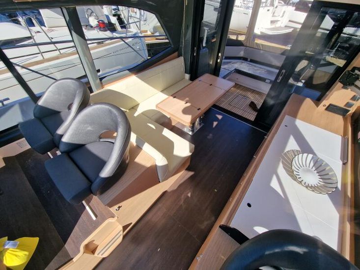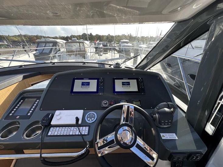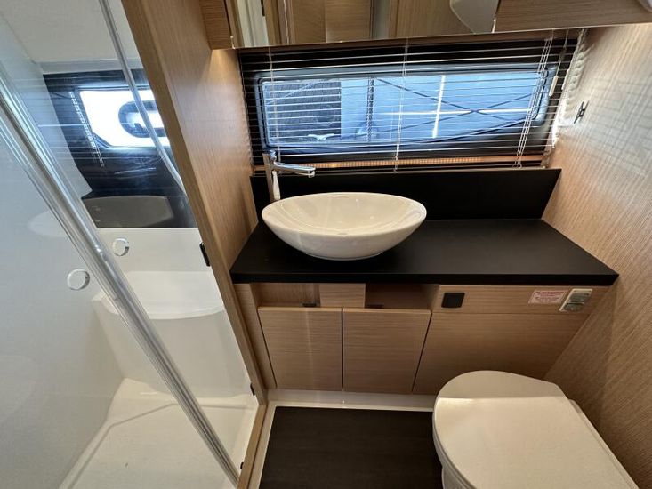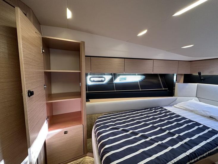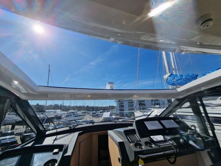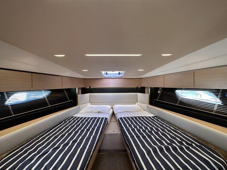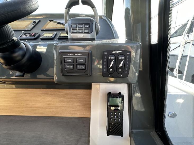Optional Equipment List: Style Plus Package, comprising: Exterior Cockpit upholstery Silvertex “white ice & carbon”Interior wood colour “Nordic Oak”/ “Wenge” FlooringInterior Upholstery leather IvoryClarion Radio CMM-30 N2K amplifier package incl. 2 speakers in saloon and 2 speakers in Cockpit (or Flybridge), remote control in saloon and flybridgeInterior/ Exterior Scatter cushion set for interior and exterior (7x patterned cushions 50x35cm, 7x plain cushions 50x50cm) Smart Power Package, comprising: Fridge 50l in separate GRP unit in cockpitBennett electric Trim TabsBow thruster (100kgf), electric incl. operating batteryMooring Kit (6 fenders, 4 mooring lines & 2 hidden stainless steel fender holders)Search Light with remote control Comfort Package, comprising: Exterior lighting package (including underwater, step, engine compartment, aft docking lights and side deck lighting)Luxury cold foam mattresses with memory top for two double bedsCamper coverLight Package interiorVenetian blinds in cabins, saloon and bathrooms Comfort Package upgrade: Luxury cold foam mattresses with memory top, one double and two single beds (only in combination with scissor berths) Navigation Package ‘Premium’, comprising: Simrad NSSevo3 12” Multifunction Display with integrated GoFree™ Wi-Fi; Bluetooth all-weather touch screen and expanded keypad on main helmstationTransducer for speed depth and temperatureSimrad RS40 VHF with inbuilt AIS Receiver + Simrad HS40 wireless handsetAutopilot with heading compassAft docking cameraSimrad 4G Broadband Radar Other optional extras fitted: Bathing platform (Tenderlift), electro hydraulic lowering with teak (maximum Dinghy allowance 250kg)Sunpad upholstery on foredeck with foldable backrest, includes dark grey BiminiStainless steel cupholder on foredeckAft cockpit fabric electric sunroof (in place of standard glass skylight)Electrical windlass including remote control in anchor locker16kg Delta anchor including 50m of galvanised chainSaloon table, foldable and manually lowerable with upholsterySliding side window, portside2 burner gas hobFisher and Paykel Drawer Dishwasher (only in combination with grey water tank 120 L)Grey water tank 120 LScissor berth in forward cabinDelivery to Barcelona and Commissioning included (including antifouling)