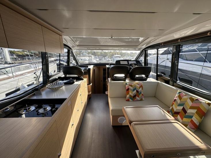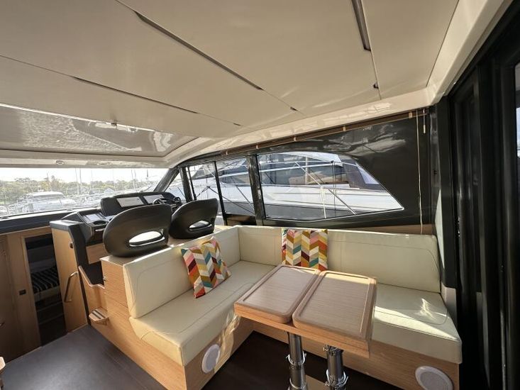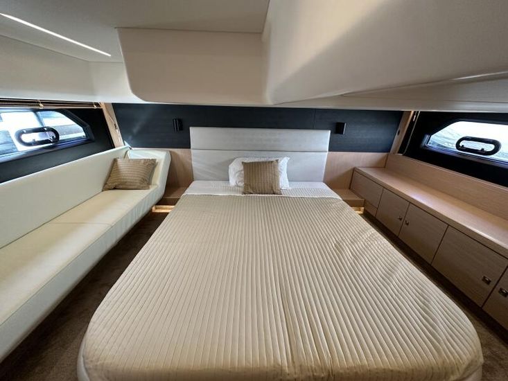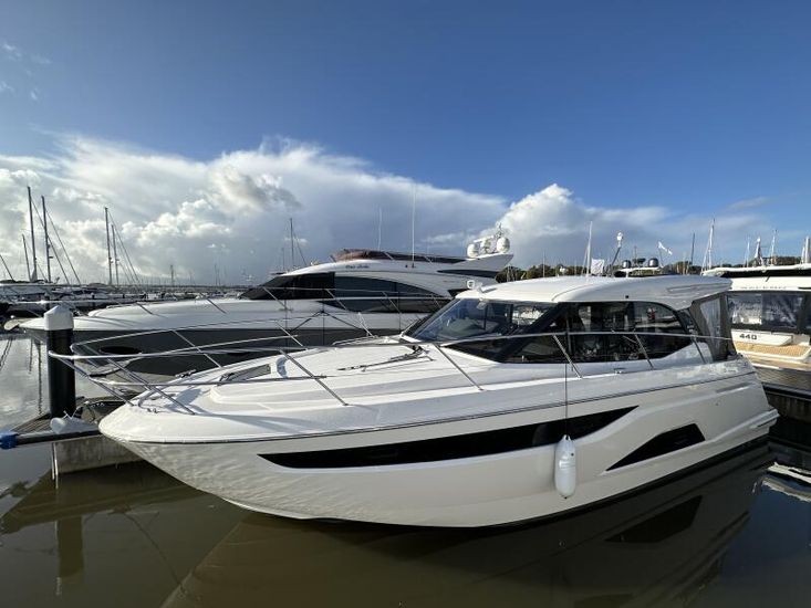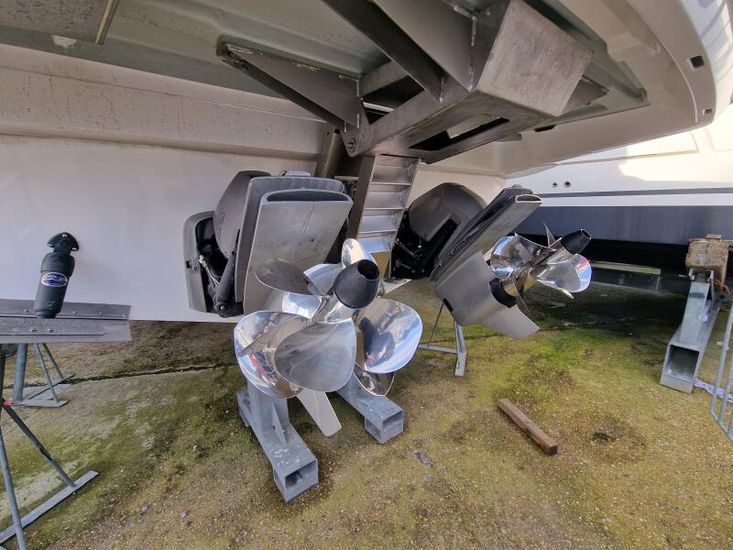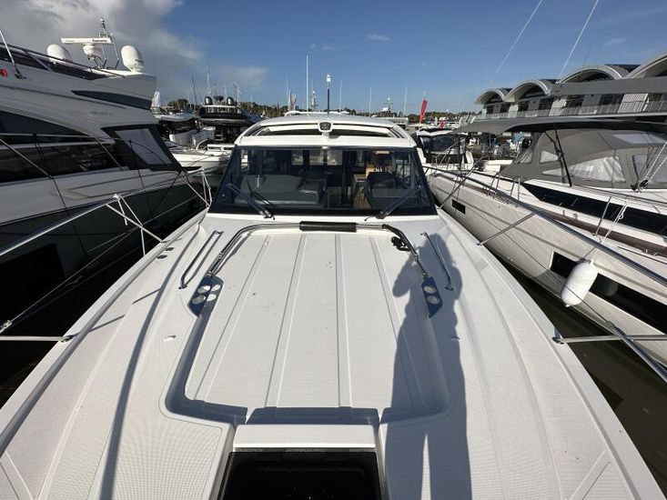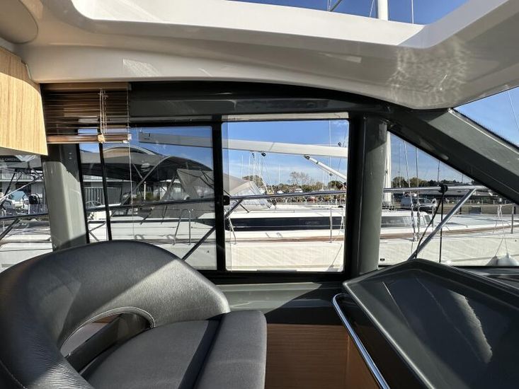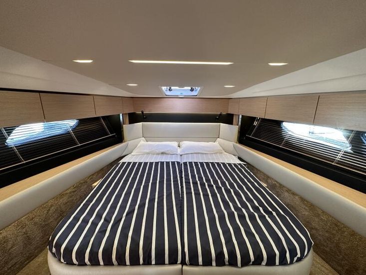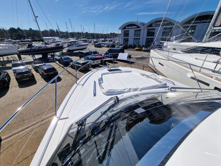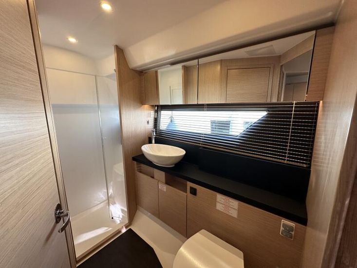 Optional Equipment List: Style Plus Package, comprising: Exterior Cockpit upholstery Silvertex “white ice & carbon”Interior wood colour “Nordic Oak”/ “Wenge” FlooringInterior Upholstery leather IvoryClarion Radio CMM-30 N2K amplifier package incl. 2 speakers in saloon and 2 speakers in Cockpit (or Flybridge), remote control in saloon and flybridgeInterior/ Exterior Scatter cushion set for interior and exterior (7x patterned cushions 50x35cm, 7x plain cushions 50x50cm) Smart Power Package, comprising: Fridge 50l in separate GRP unit in cockpitBennett electric Trim TabsBow thruster (100kgf), electric incl. operating batteryMooring Kit (6 fenders, 4 mooring lines & 2 hidden stainless steel fender holders)Search Light with remote control Comfort Package, comprising: Exterior lighting package (including underwater, step, engine compartment, aft docking lights and side deck lighting)Luxury cold foam mattresses with memory top for two double bedsCamper coverLight Package interiorVenetian blinds in cabins, saloon and bathrooms Comfort Package upgrade: Luxury cold foam mattresses with memory top, one double and two single beds (only in combination with scissor berths) Navigation Package ‘Premium’, comprising: Simrad NSSevo3 12” Multifunction Display with integrated GoFree™ Wi-Fi; Bluetooth all-weather touch screen and expanded keypad on main helmstationTransducer for speed depth and temperatureSimrad RS40 VHF with inbuilt AIS Receiver + Simrad HS40 wireless handsetAutopilot with heading compassAft docking cameraSimrad 4G Broadband Radar Other optional extras fitted: Bathing platform (Tenderlift), electro hydraulic lowering with teak (maximum Dinghy allowance 250kg)Sunpad upholstery on foredeck with foldable backrest, includes dark grey BiminiStainless steel cupholder on foredeckAft cockpit fabric electric sunroof (in place of standard glass skylight)Electrical windlass including remote control in anchor locker16kg Delta anchor including 50m of galvanised chainSaloon table, foldable and manually lowerable with upholsterySliding side window, portside2 burner gas hobFisher and Paykel Drawer Dishwasher (only in combination with grey water tank 120 L)Grey water tank 120 LScissor berth in forward cabinDelivery to Barcelona and Commissioning included (including antifouling)