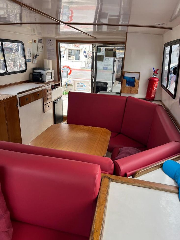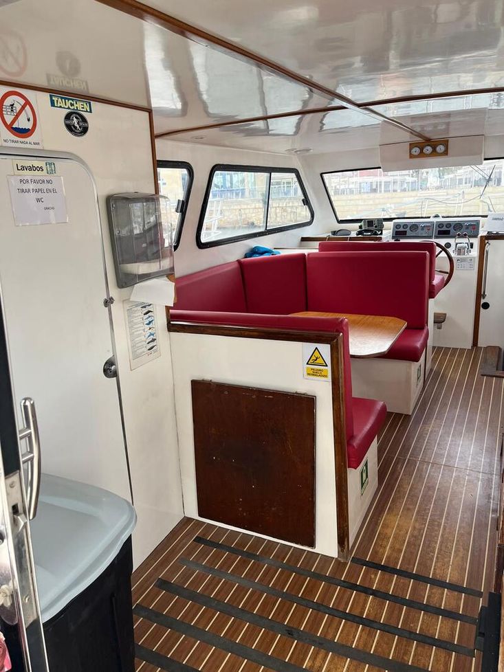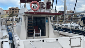 Number of passengers: 12 + 2 crew. Two inboard Yanmar engines, total power 544 kW, shafts, 4-stroke, injection, diesel. Cruising speed 12 knots and maximum speed 25 knots.
